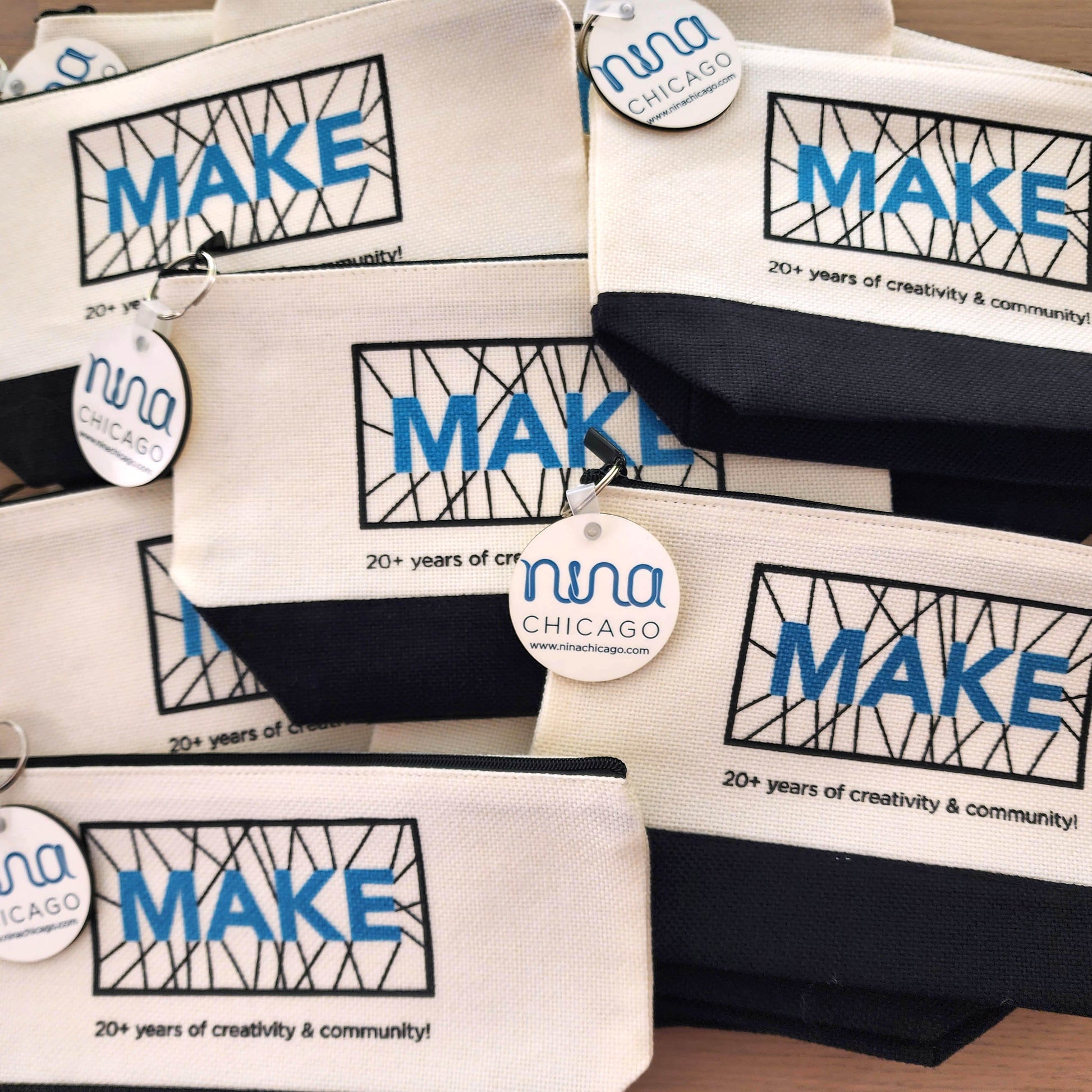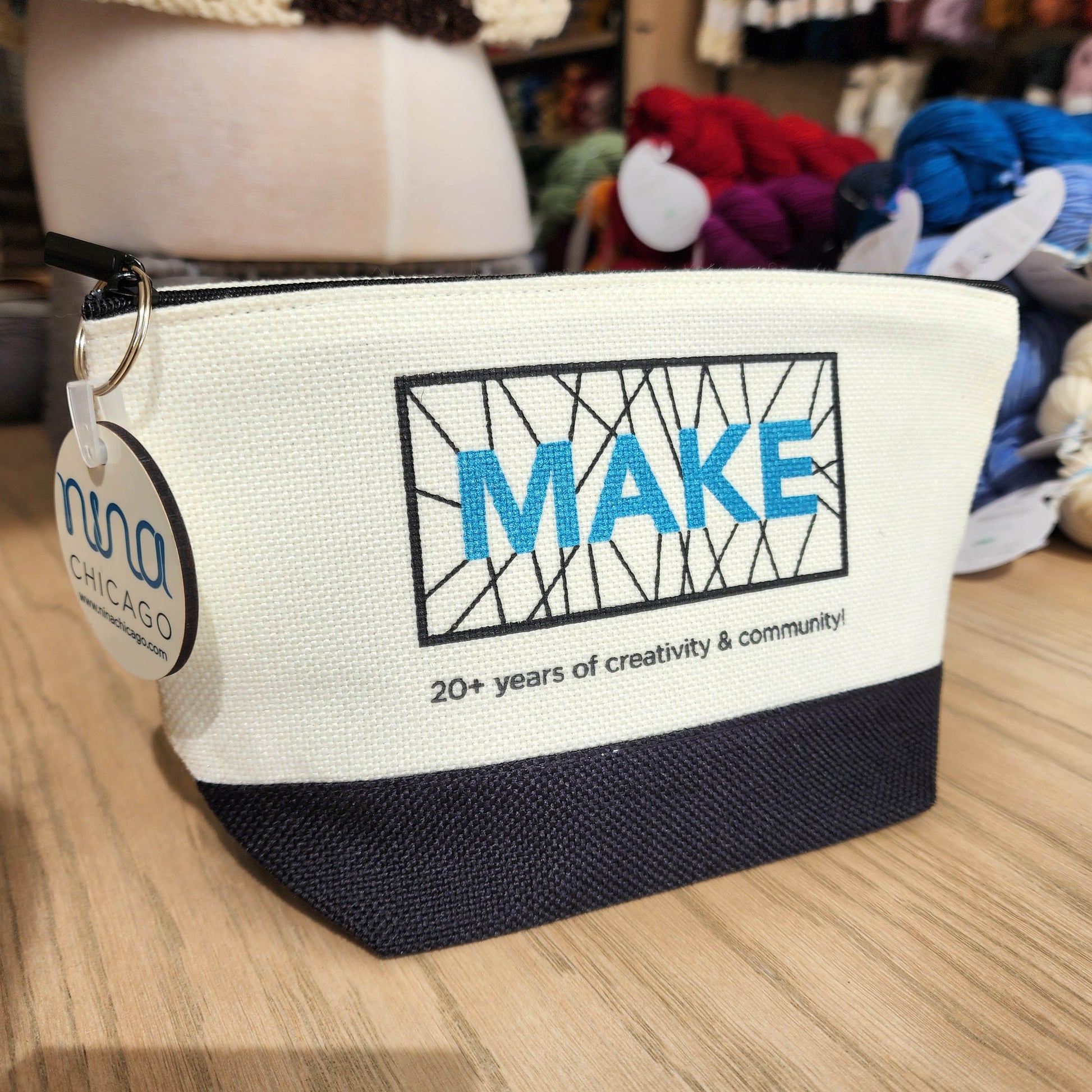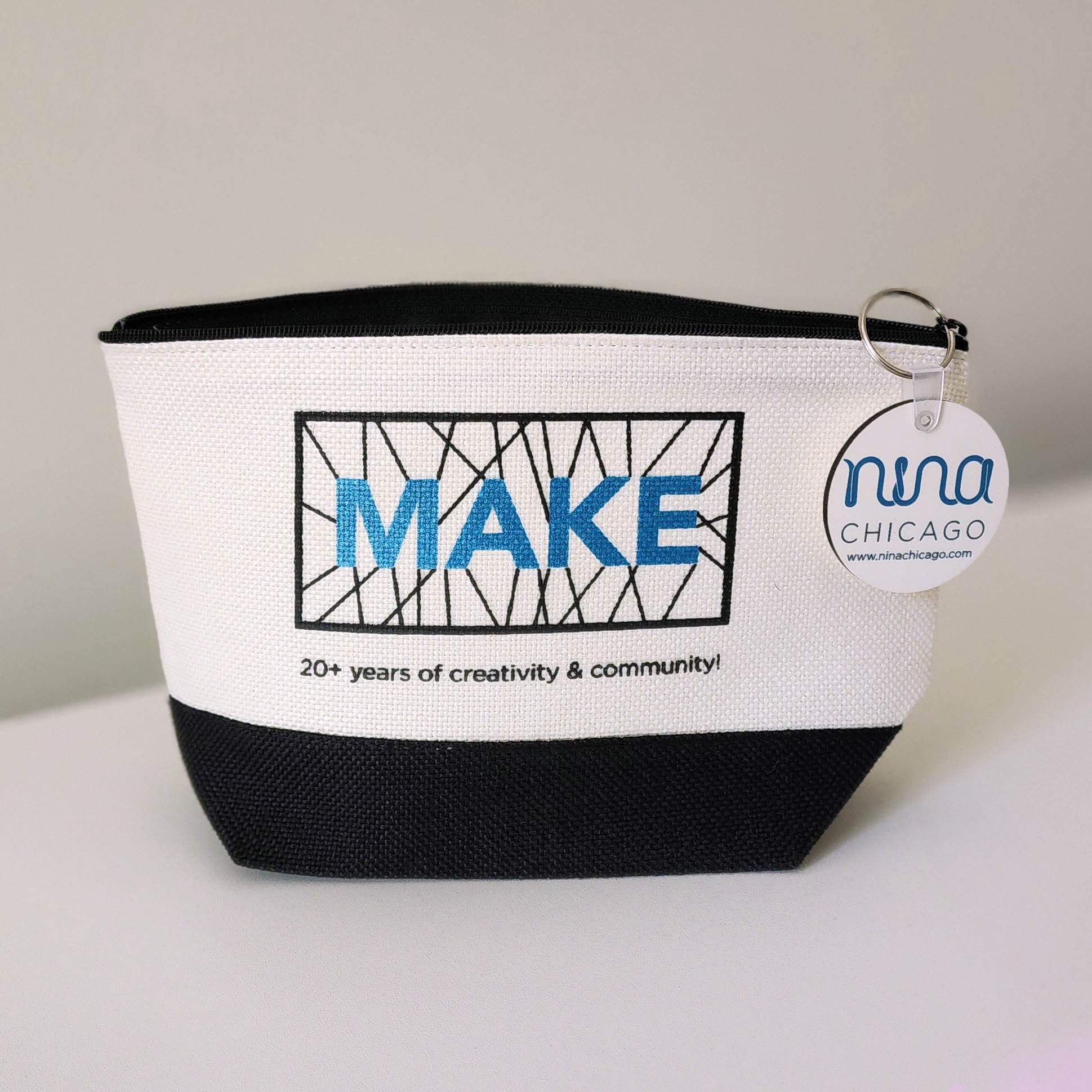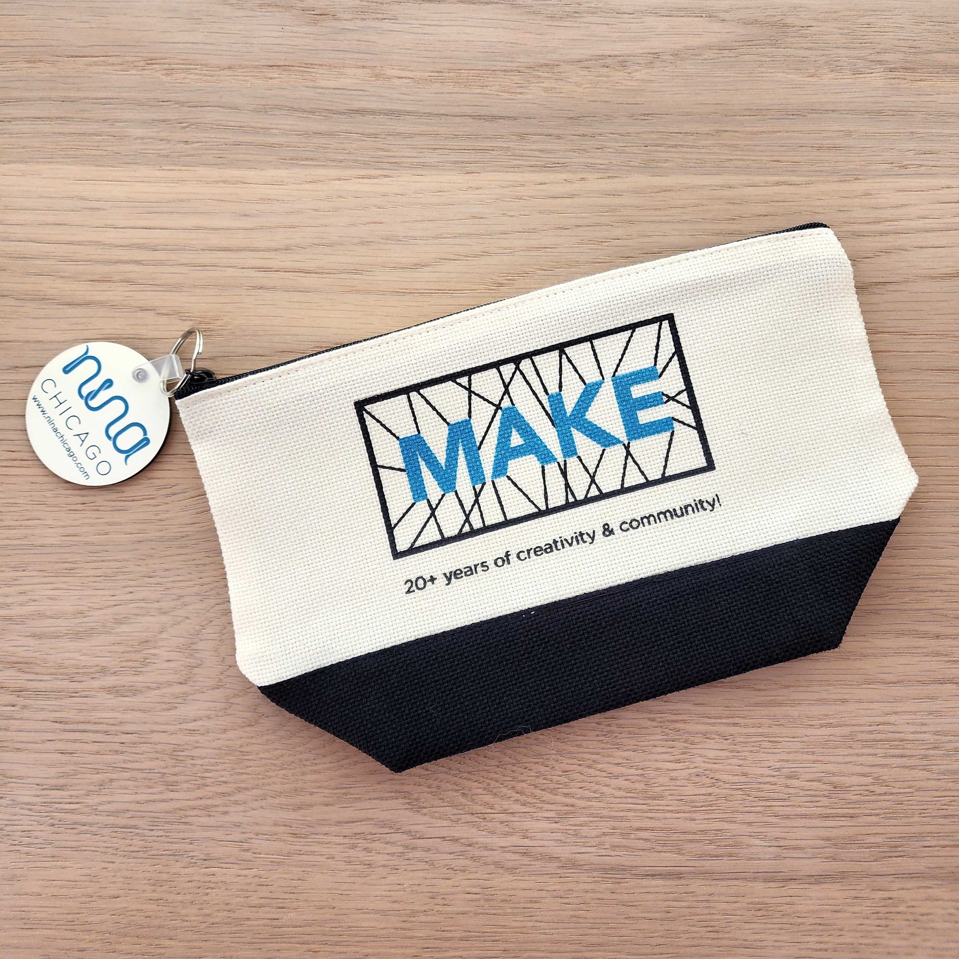 This bag was made especially for our event, and features an image of our Make Wall in blue shimmer letters against a black & white background. A nice large zipper pull with our logo on it has also been added for ease of use! The bag measures 9" x 5.5" while laying flat, and 5" tall when standing up with a generous 3.5" gusset. Get yours while they last!