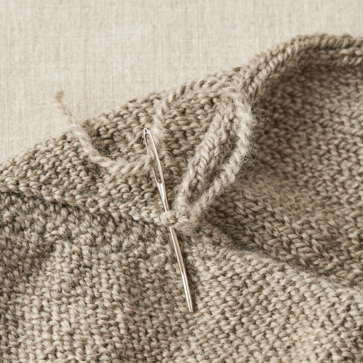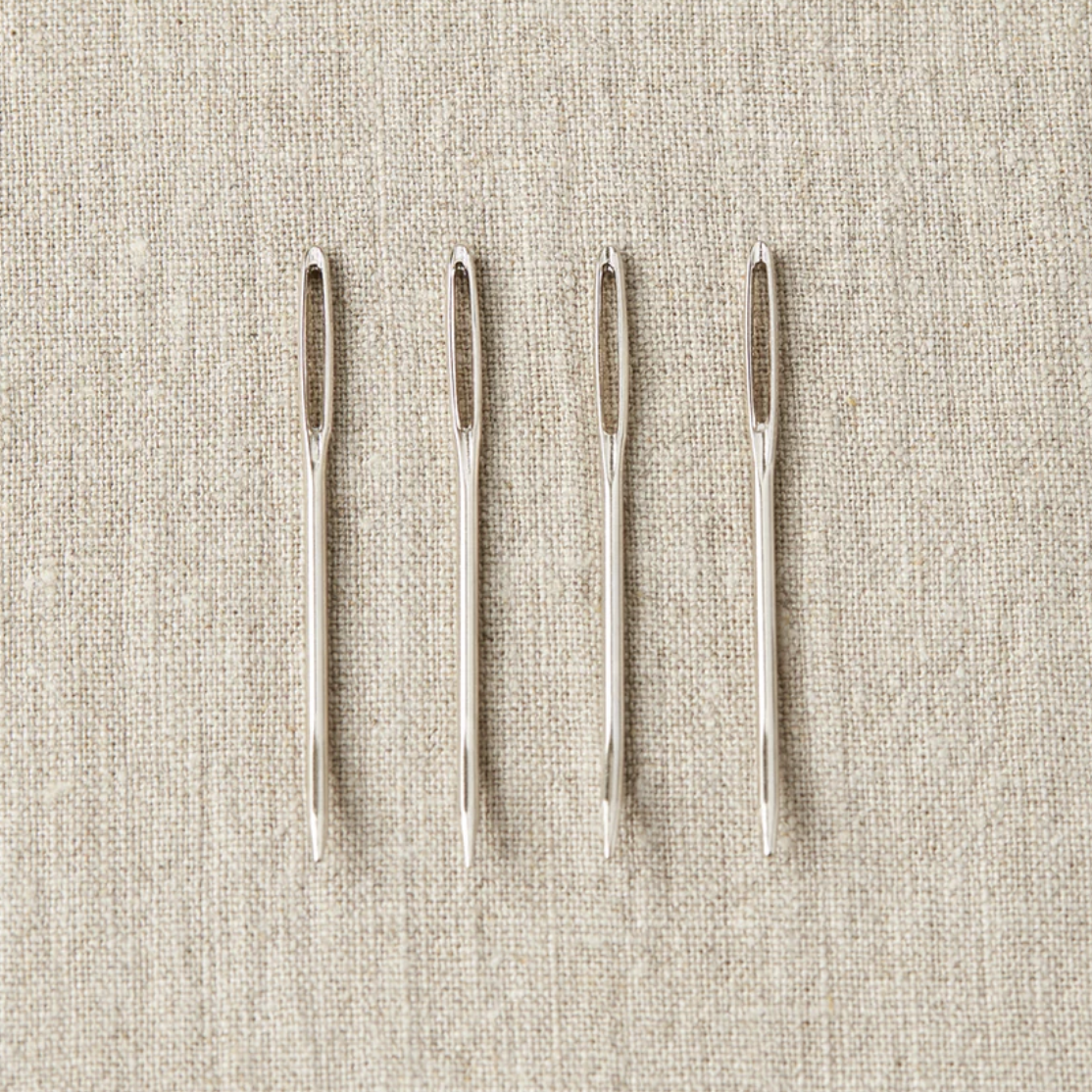 These bent-tip tapestry needles are the best for seaming and weaving in ends! The bend is subtle but make maneuvering through the stitches so much easier. This set contains 2 large needles and 2 small needles with large eyes to accommodate many weights of yarn. Compatible with the Maker's Keep. Made of nickel-plated steel.