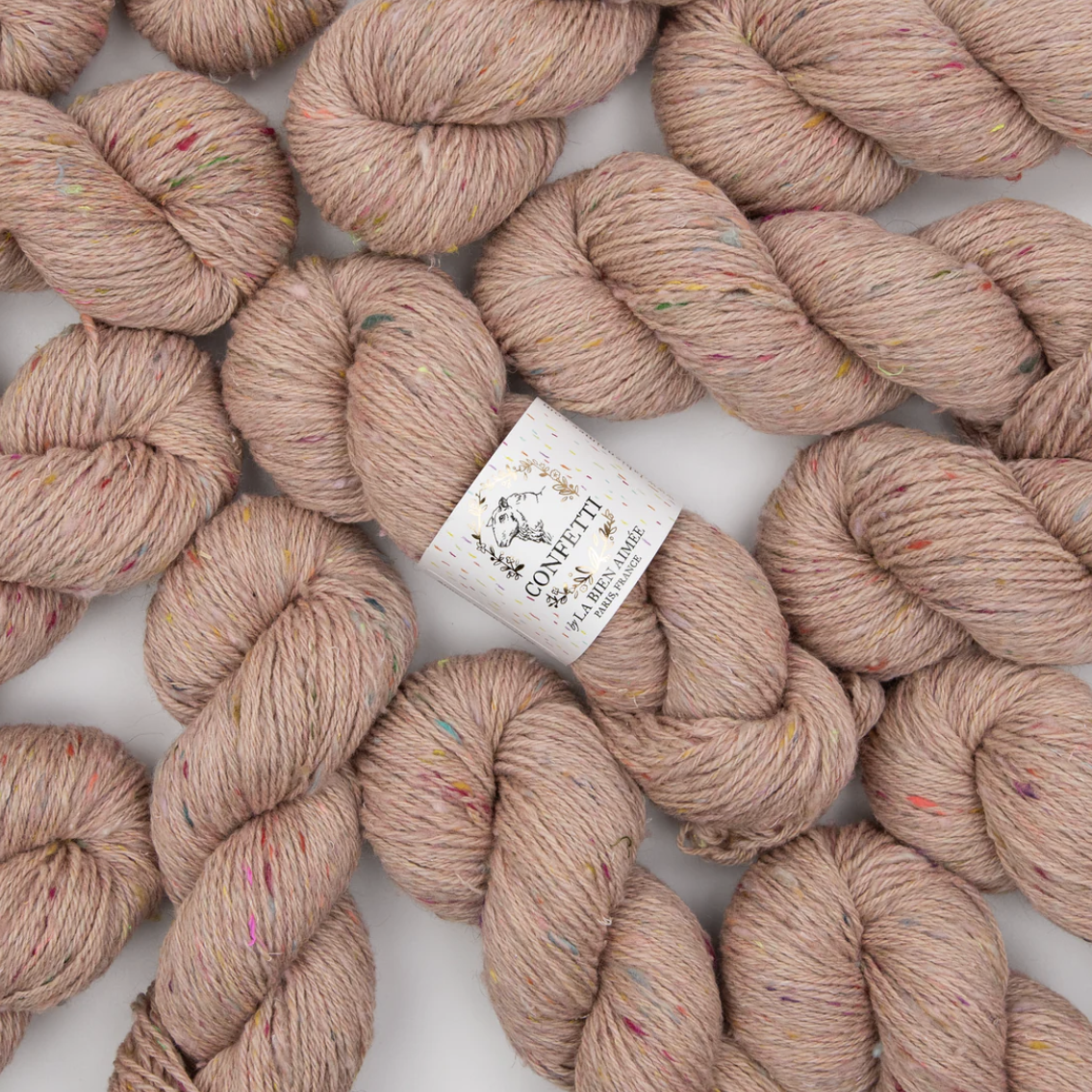 Confetti is a truly unique yarn. It is made from upcycled hand-dyed yarn threads from Paris's La Bien Aimée studio, spun with a custom blend for an irresistibly soft texture. Featuring a tweedy and plush feel, it is suitable to be worn close to the skin and can also be knit up as a worsted, due to the varying thickness of the added yarn threads. La Bien Aimée is lovingly hand dyed in the most beautiful colors in Paris, France.