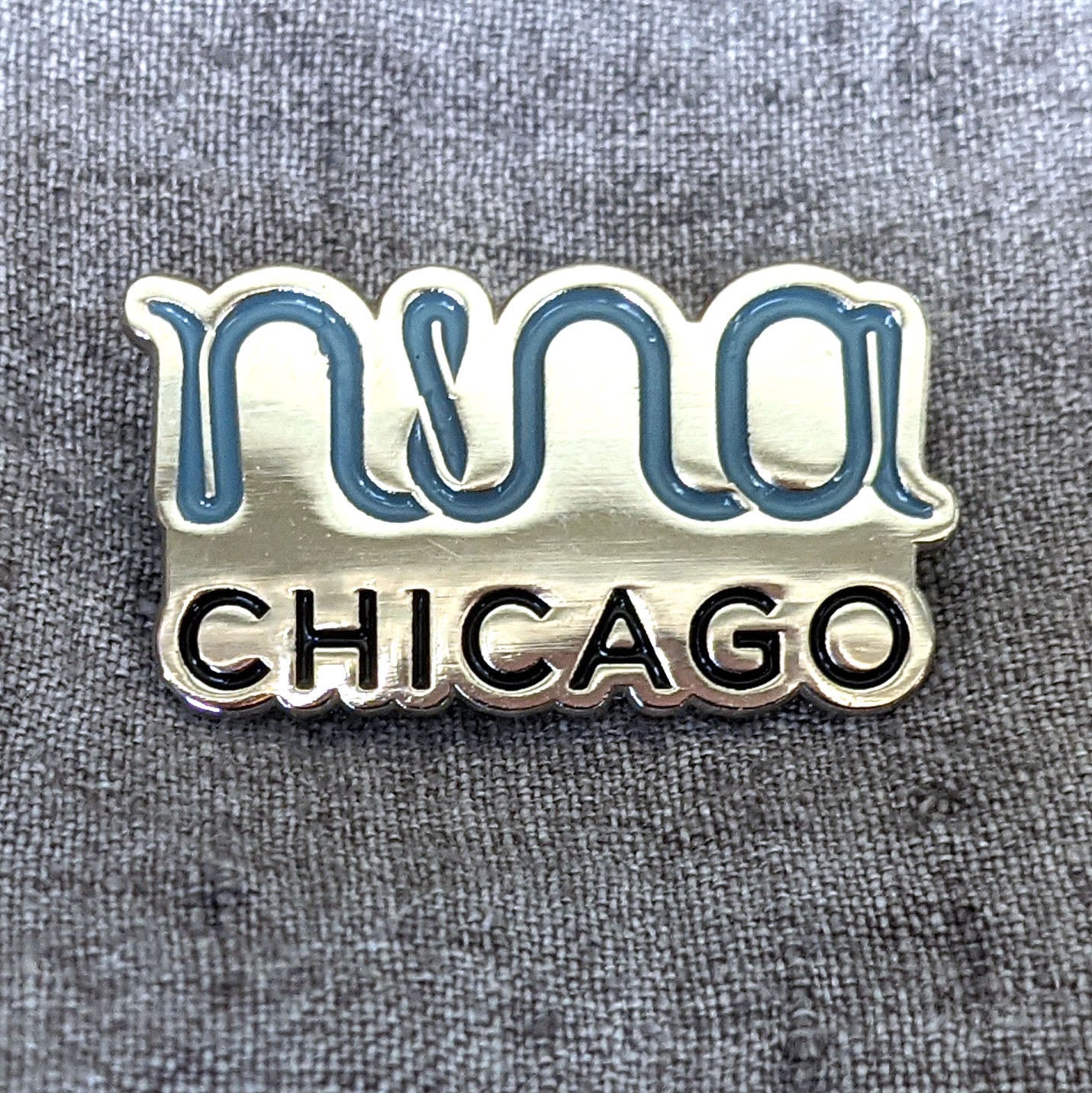 Our logo pin, "Nina Chicago" is 1.25" wide by .75" tall and has our logo blue enamel on a mirror background.