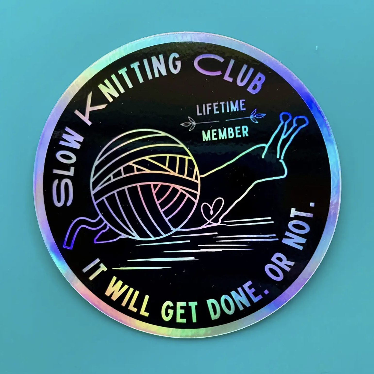 Add some color-changing holograms to your sticker collection, while also showing a little of your stitching personality. Small sticker is about 2.5" round and larger sticker with border is 3" round.