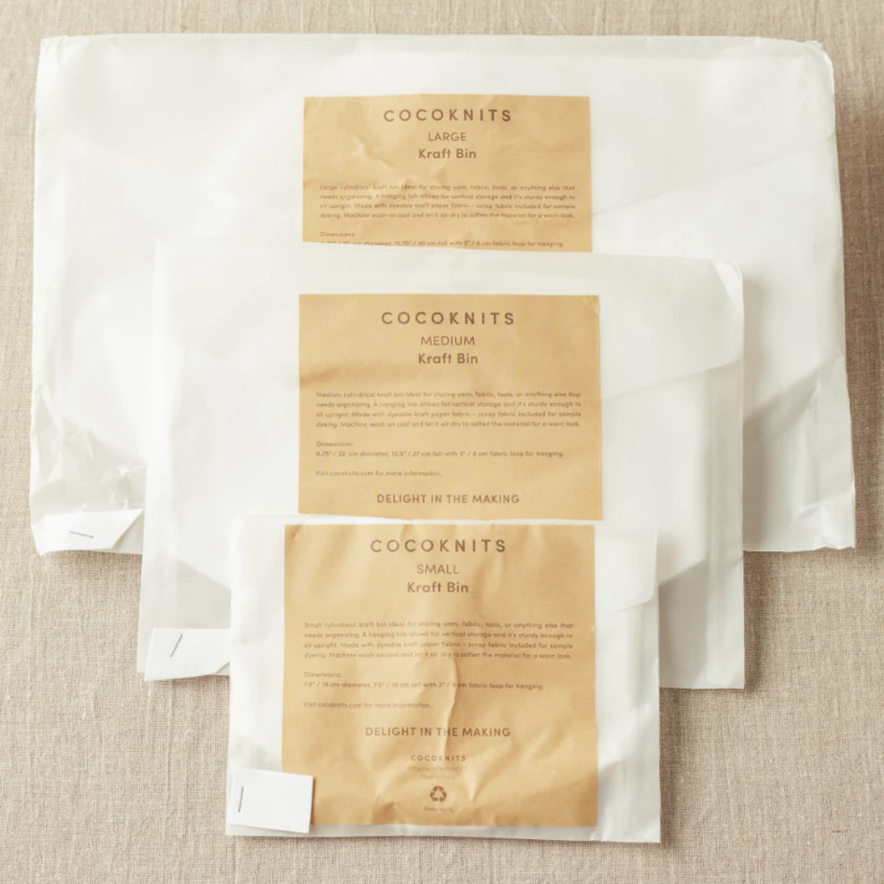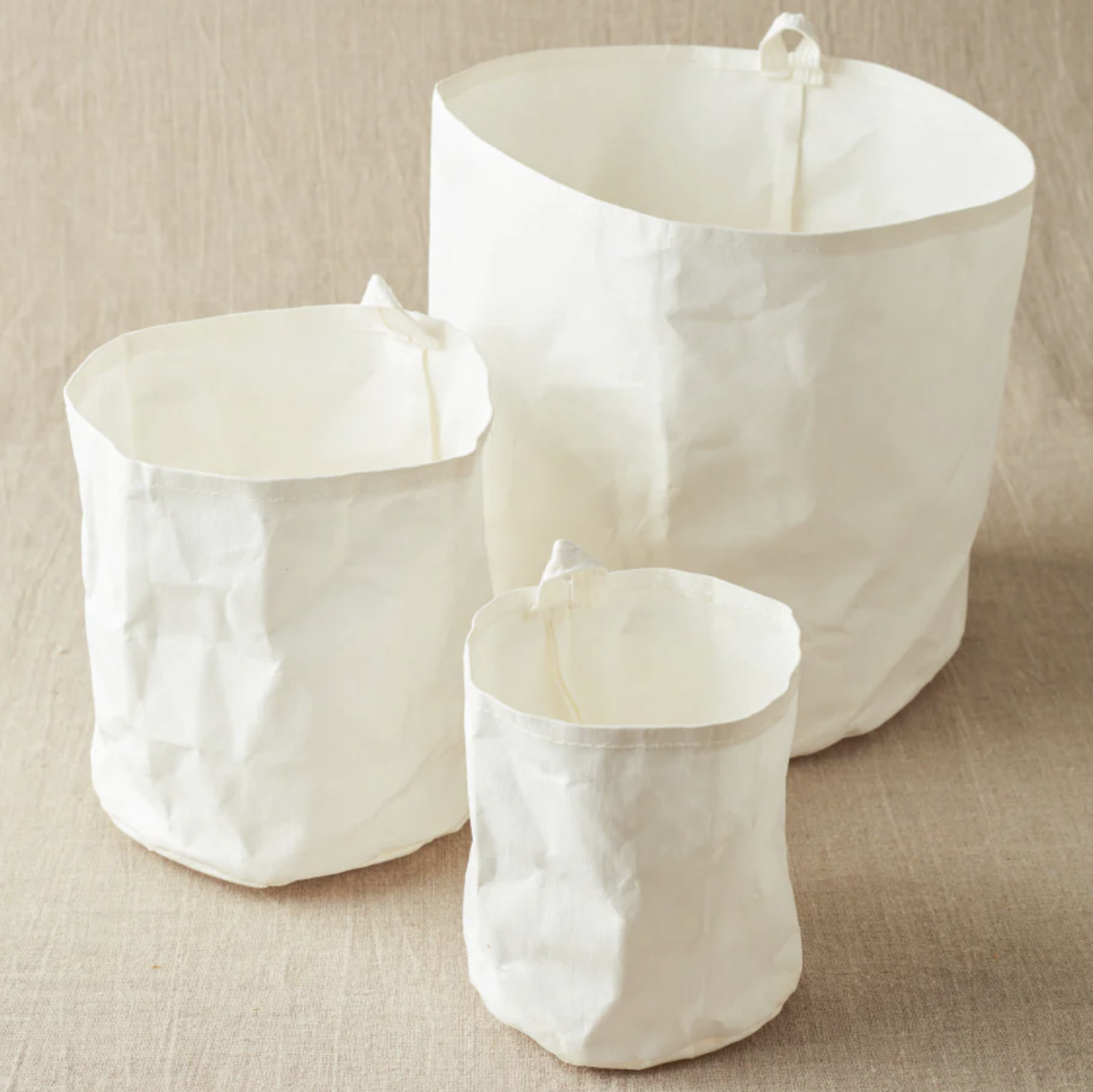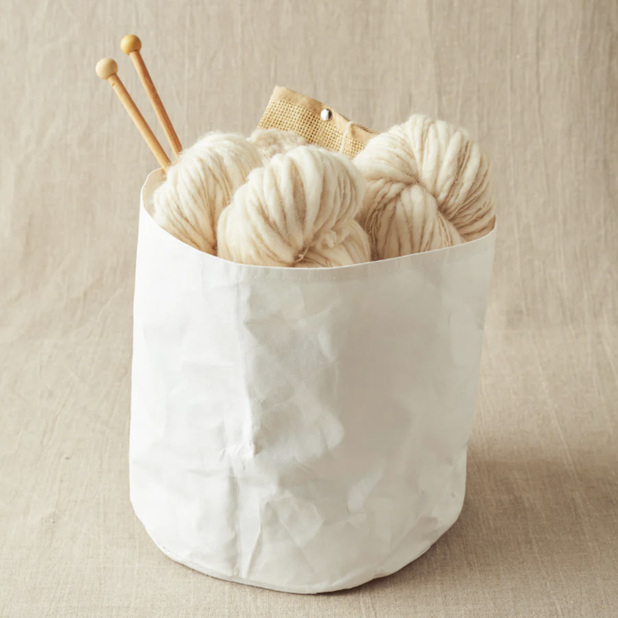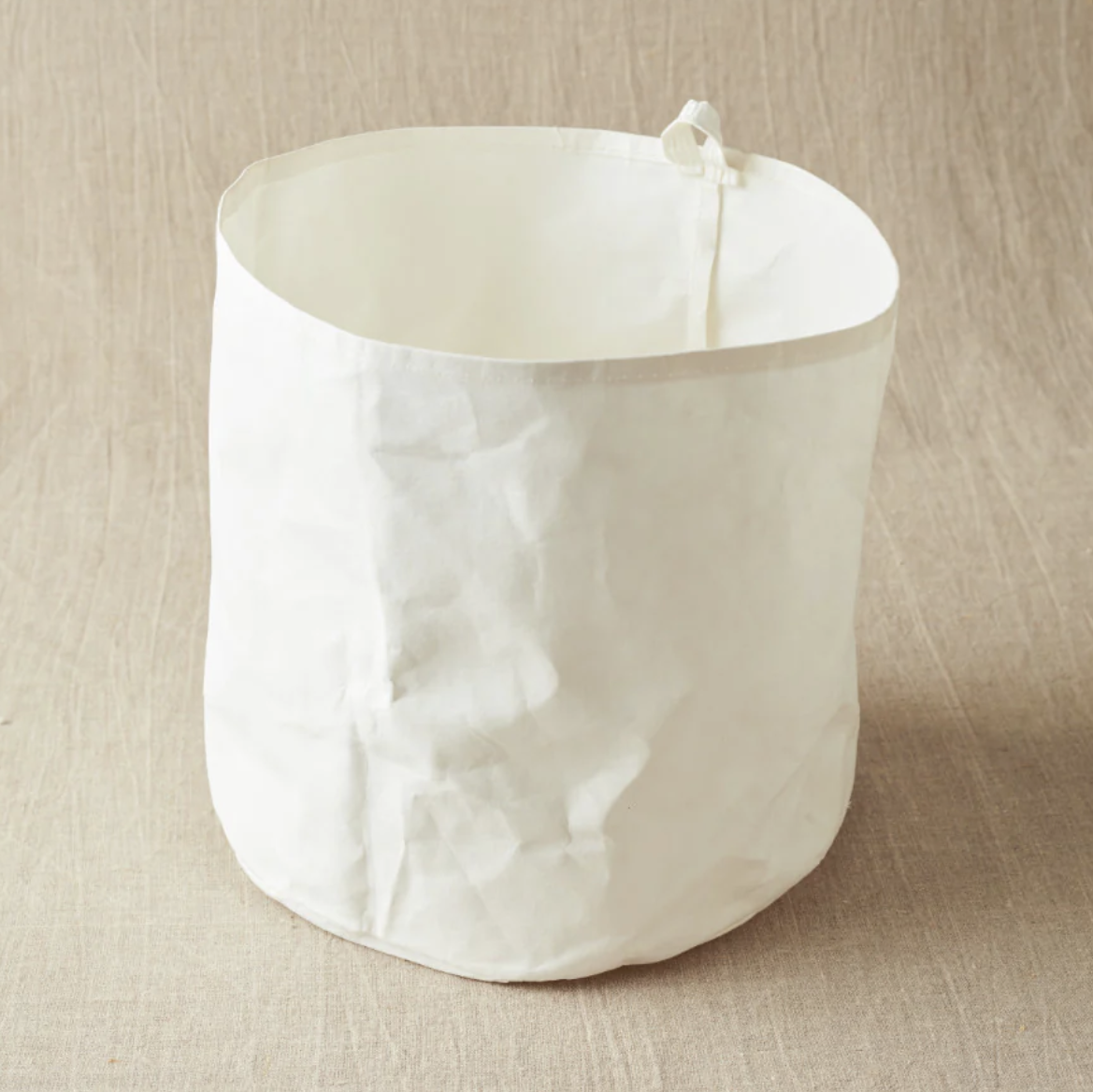These round bins from Cocoknits are the perfect storage solution for your yarn, projects, and more! They are lovely to look at and made of a durable kraft paper fabric that is machine washable. A 3" loop is attached for convenient hanging. While they stand up easily, they are easily collapsible. If you want to dye or otherwise decorate it, the white color makes it easy and included is a scrap piece for testing different dyeing methods.