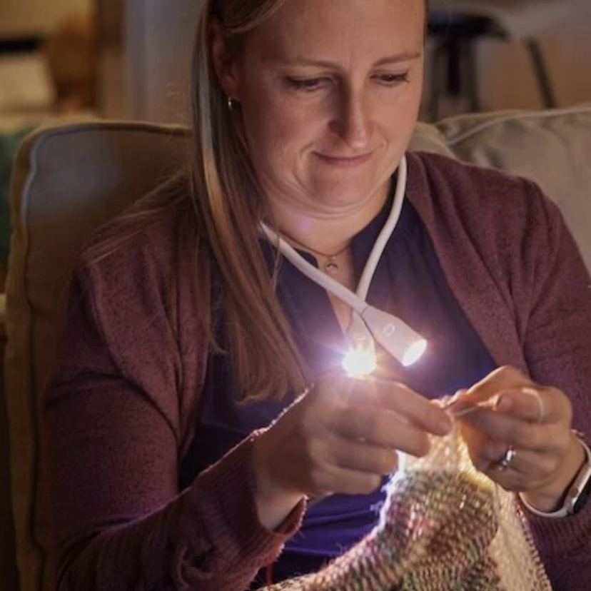 Stop straining your eyes! Knit and crochet more comfortably with the Lumos Knitting Light. Simply place the light around your neck and use the buttons to control the power, light temperature, and brightness. Easy on your neck and posture, you can take this light with you anywhere you take your stitches... on a plane, in a car, etc. It is also so much easier to work with those dark yarns you've been avoiding for so long!
