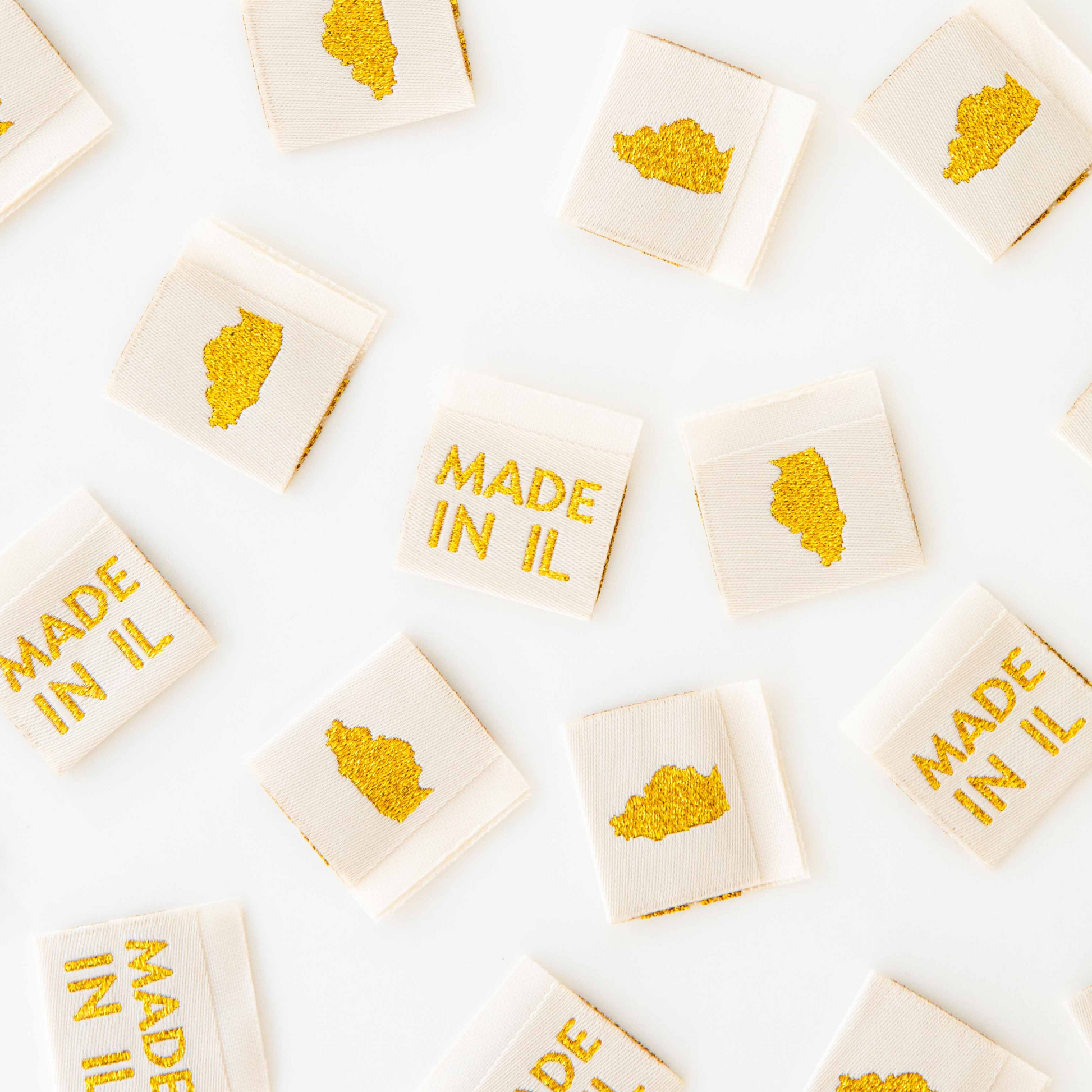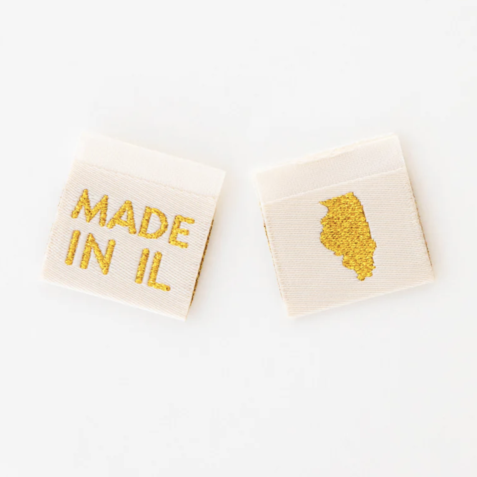 These labels from Sarah Hearts will add a touch of whimsy to your makes! Never let anyone forget where your hand mades came from. Flaunt your favorite home state with this one. One side has IL and the other has the IL silhouette, both in metallic gold. Machine wash cold, tumble dry low.