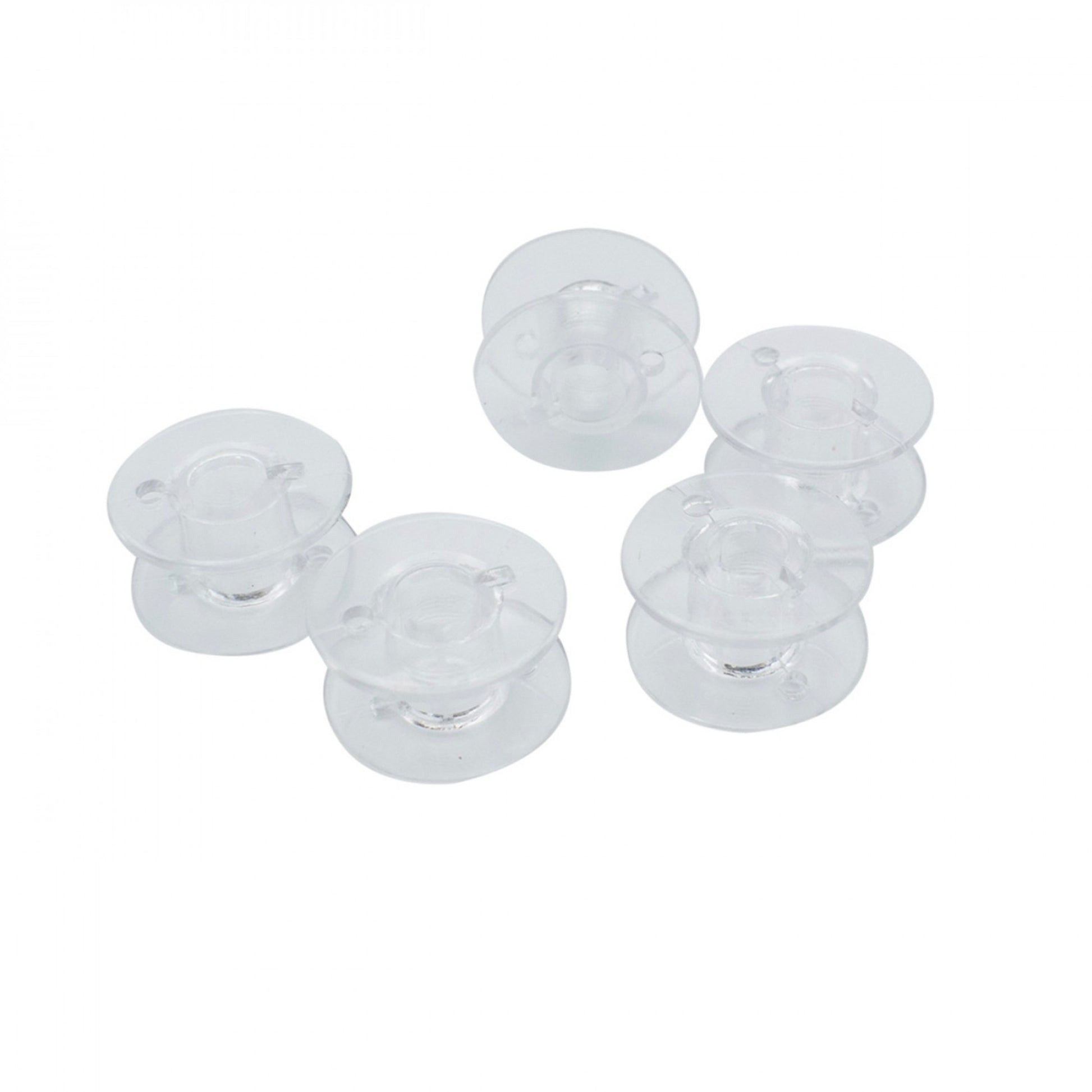A set of 5 plastic sewing machine bobbins sized to fit in models that can accommodate Class 15 size bobbins.