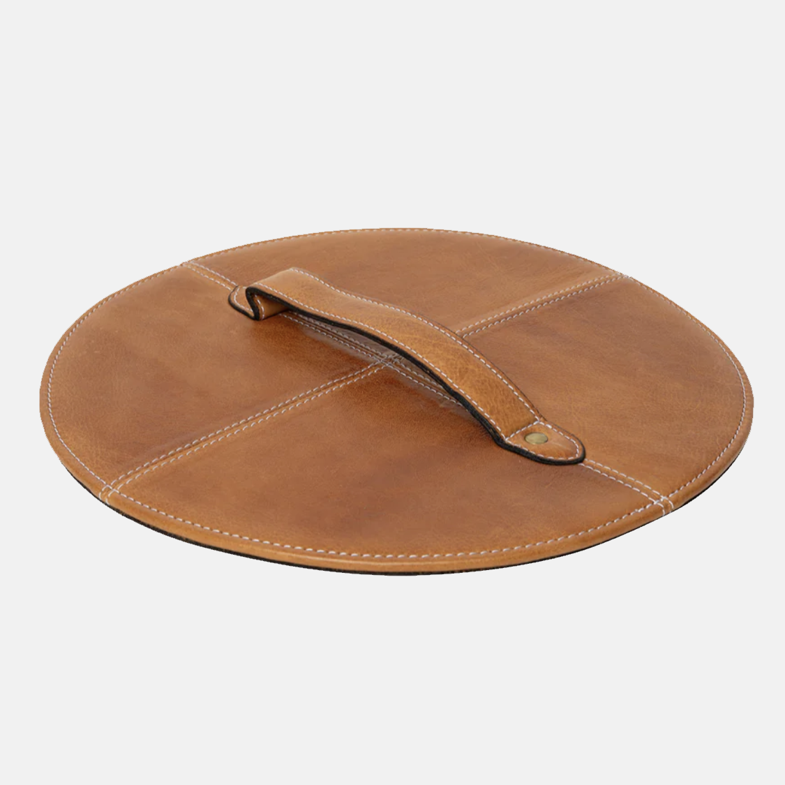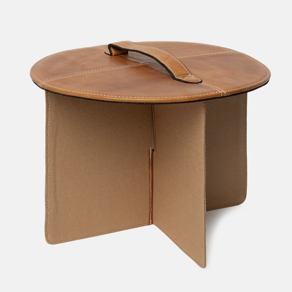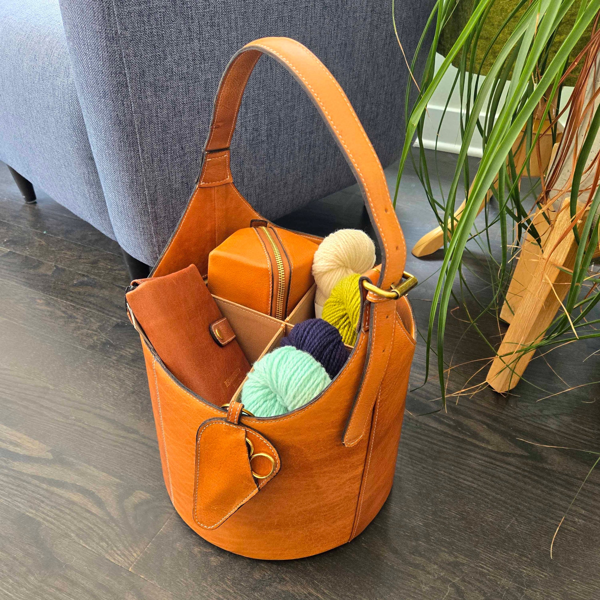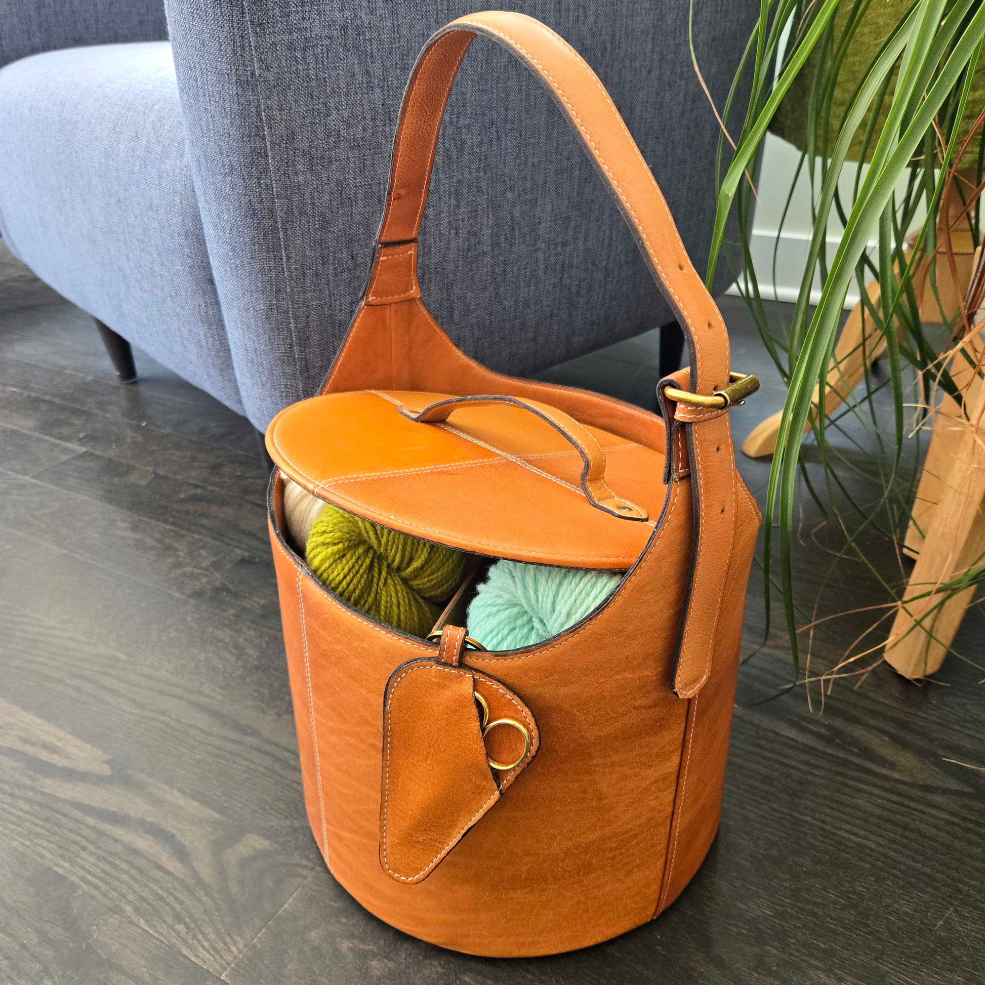 Project 26 is a round leather bucket, complete with a divider and matching lid, so you can store your yarn and projects both practically and stylishly. It will look beautiful in your home while keeping dust, pets, and everything else out of your crafts. A strap on top of the bucket makes it easy to grab and go. The bucket and lid are made of 100% leather and the coordinating sturdy divider is covered with cotton fabric. Measures 8.7" H X 10.6" W x 10.6" D. Available in burned tan and shown with Project 63 scissor protector, sold separately.