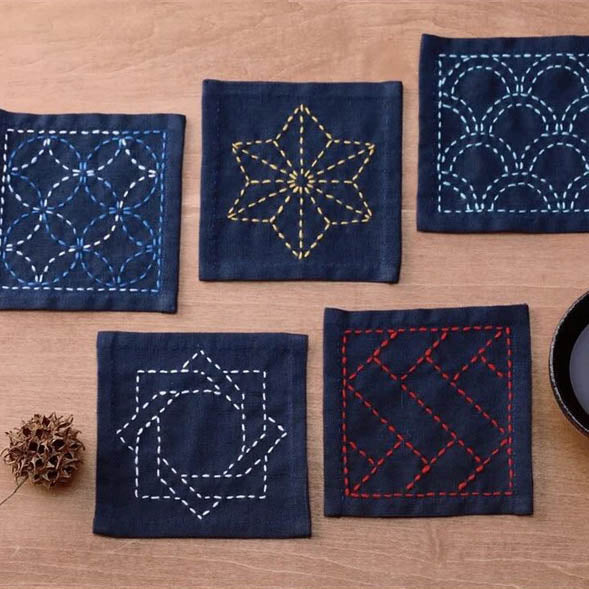 Sashiko is a traditional Japanese stitching technique with lots of rich history. Stitching these simple lines and patterns into cloth is a meditative tradition. Each of these samplers includes five pre-printed coaster designs, on a cotton cloth measuring a total of 6" x 26.5". Patterns wash out with water after you have stitched over them.