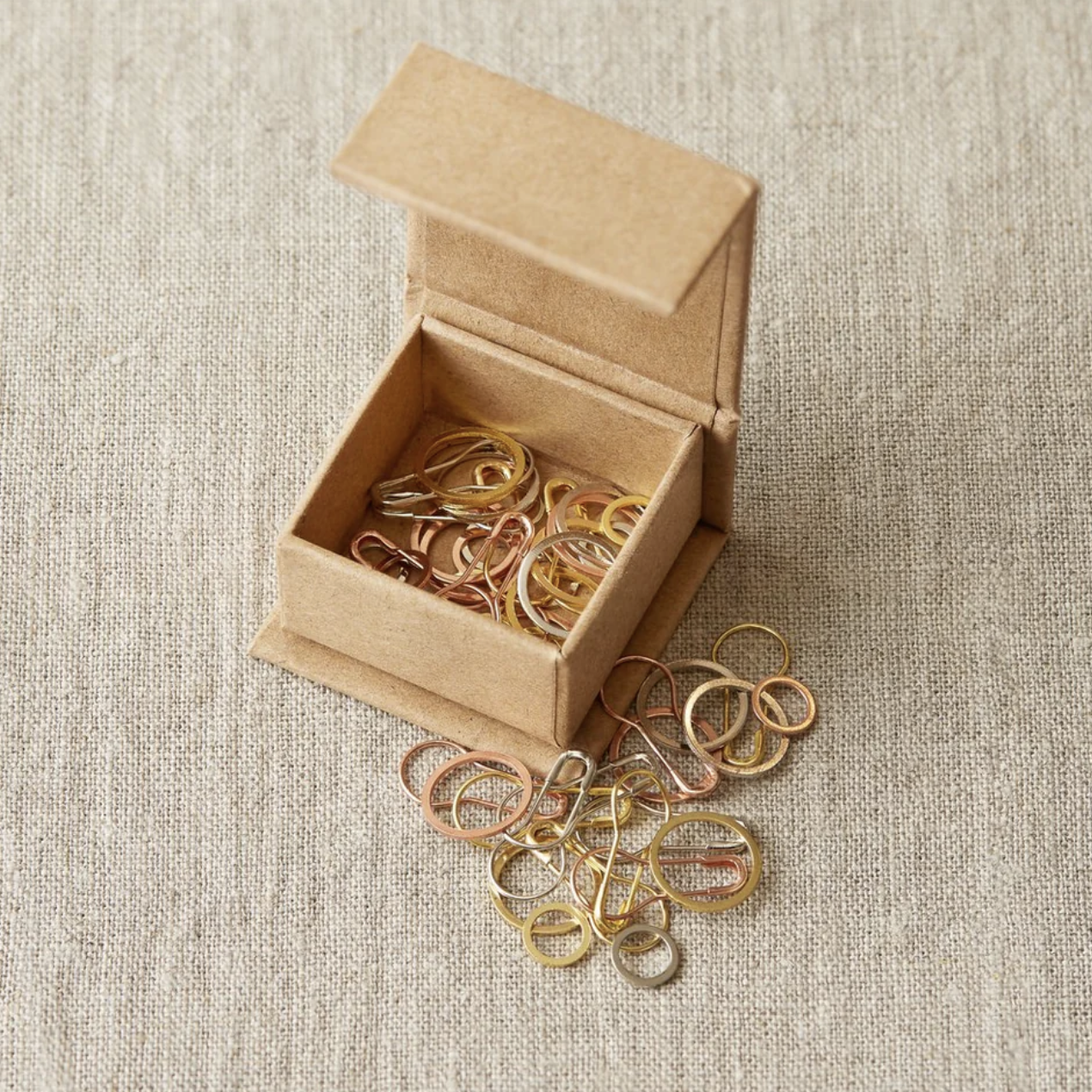 This set includes 18 large round stitch markers that fit up to a size US 15 needle, 18 small round stitch markers that fit up to a size US 9 needle, and 18 opening stitch markers that fit up to a size US 11 needle. All come in a cute little kraft box with a magnetic closure.