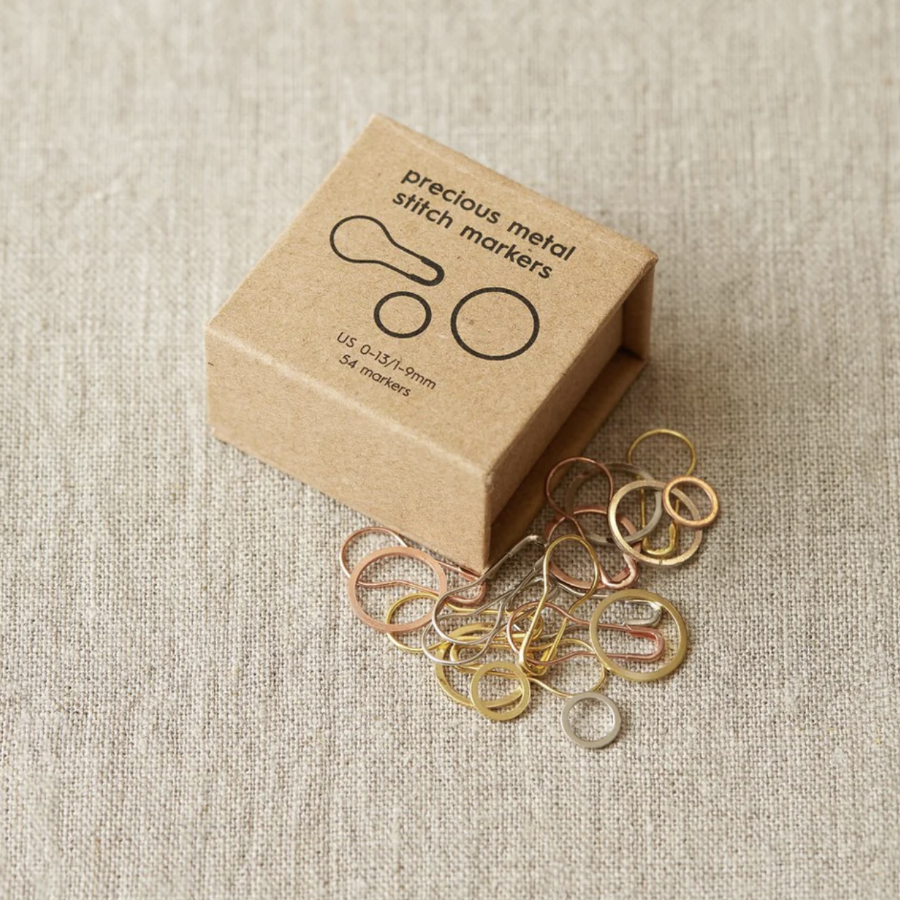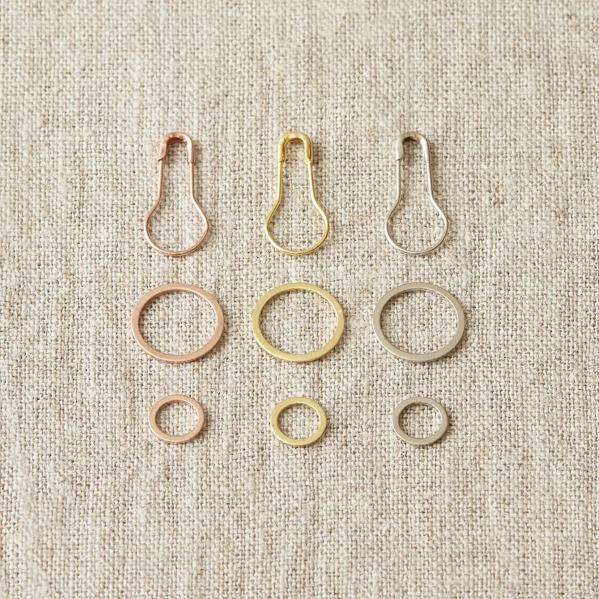 With the most bling of all the Cocoknits stitch markers, this set comes in gold, silver, and copper. As with the other markers, these have a steel base and will stick to your Maker's Keep, Maker's Board, or any other magnetic surface.