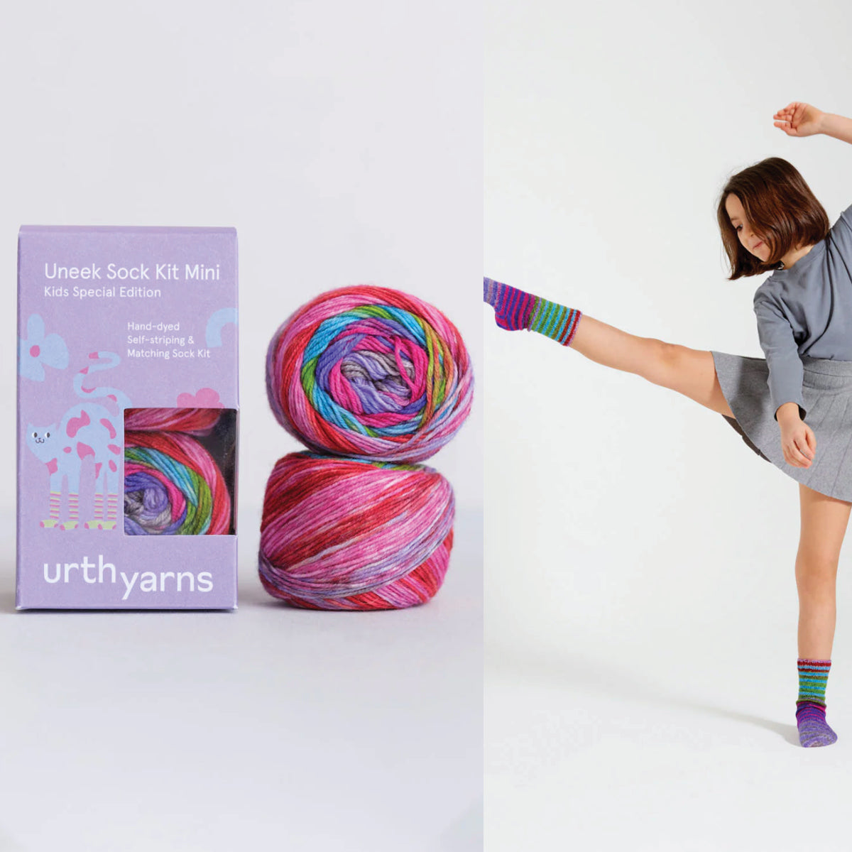 The Uneek Sock Mini Kit is "uneekly-designed" to achieve that perfect pair of matching striped socks, with the stripes scaled down for smaller feet. Each colorway leads you through four striped pair sets, changing colors for you so you can focus on your stitching and not have to weave in a bunch of ends.